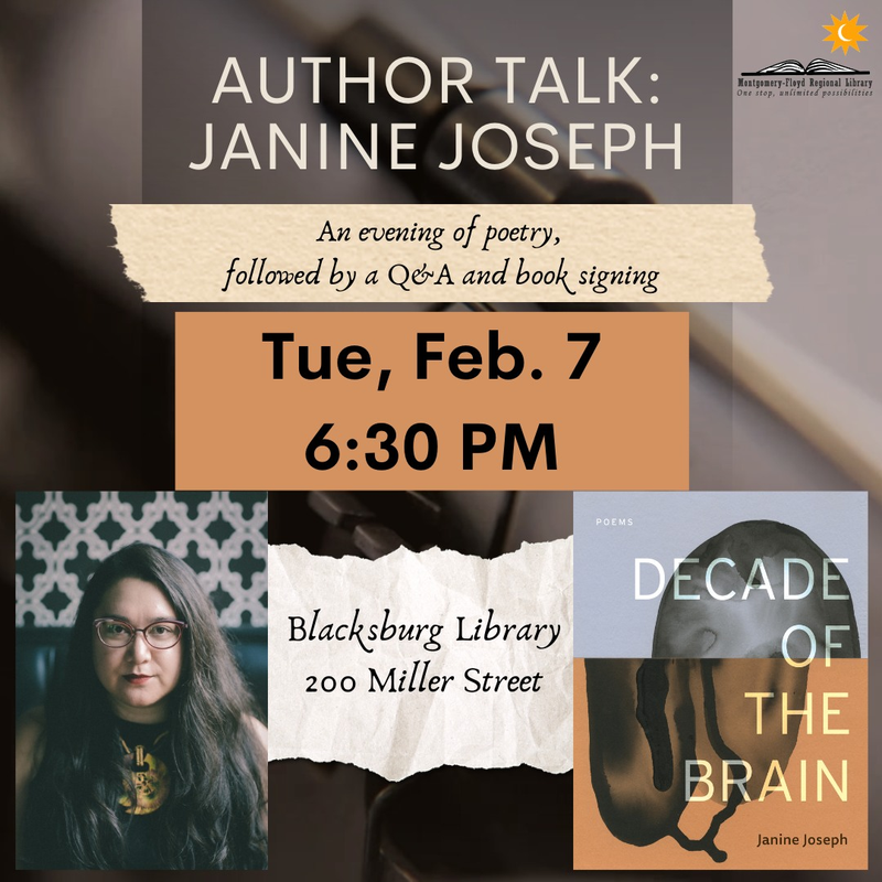 Enjoy an evening of poetry as Janine Joseph reads from her newest book, "Decade of the Brain". A Q&A session and book signing will follow the talk. Books will be on sale courtesy of Blacksburg Books.