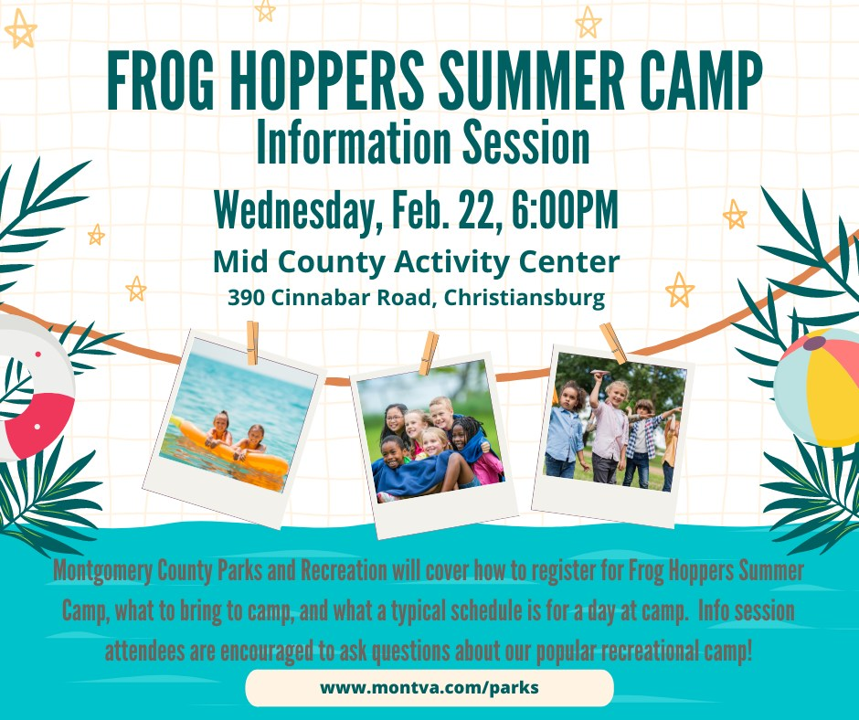 Montgomery County Parks and Recreation presents Frog Hoppers Summer Camp Information Session on Wednesday, February 22, 2023 at the Mid County Park Activity Center in Christiansburg, VA.