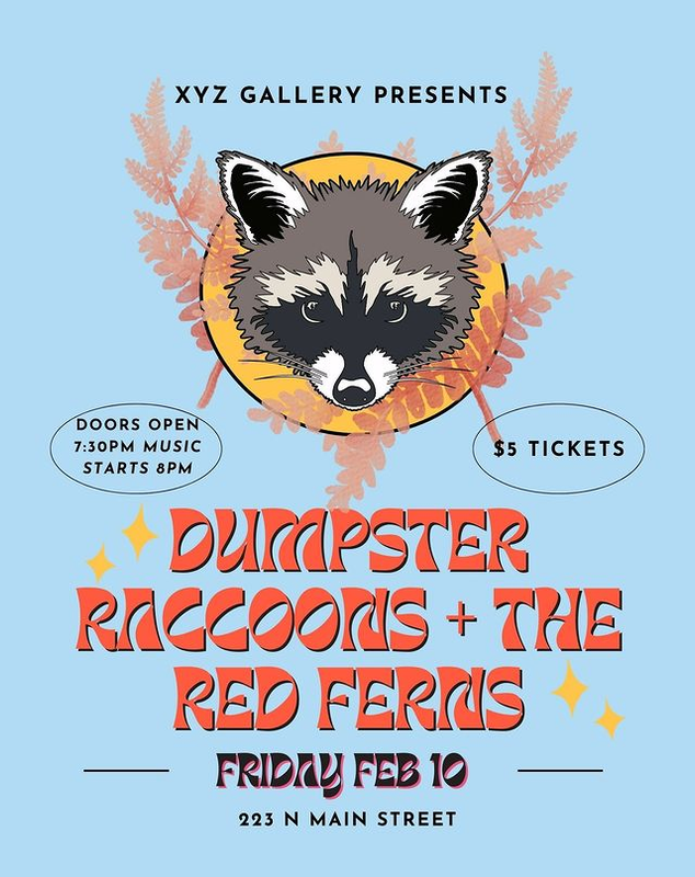 XYZ Art Gallery presents Dumpster Raccoons and The Red Ferns in concert on Friday, February 10, 2023.