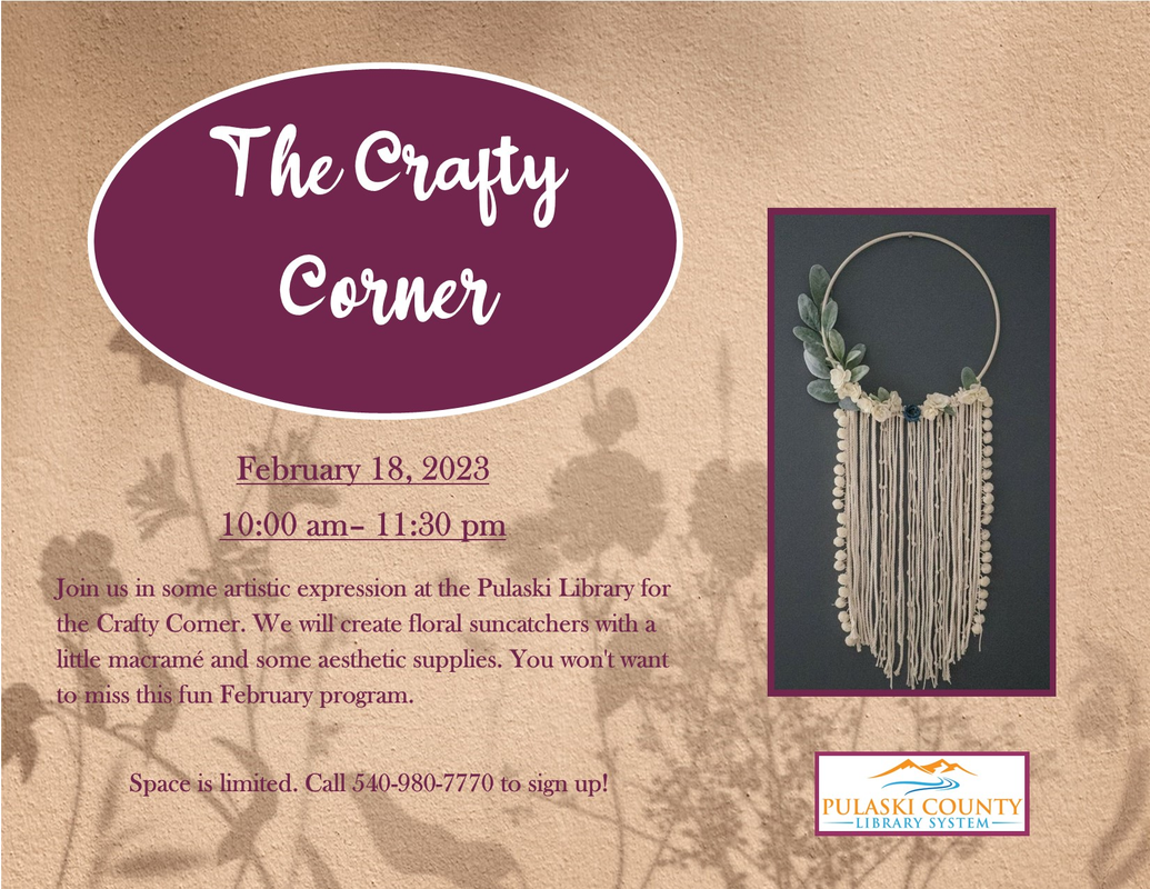 Join us in some artistic expression at the Pulaski Library for the Crafty Corner. We will create floral suncatchers with a little macramé and some aesthetic supplies. You won't want to miss this fun February program!