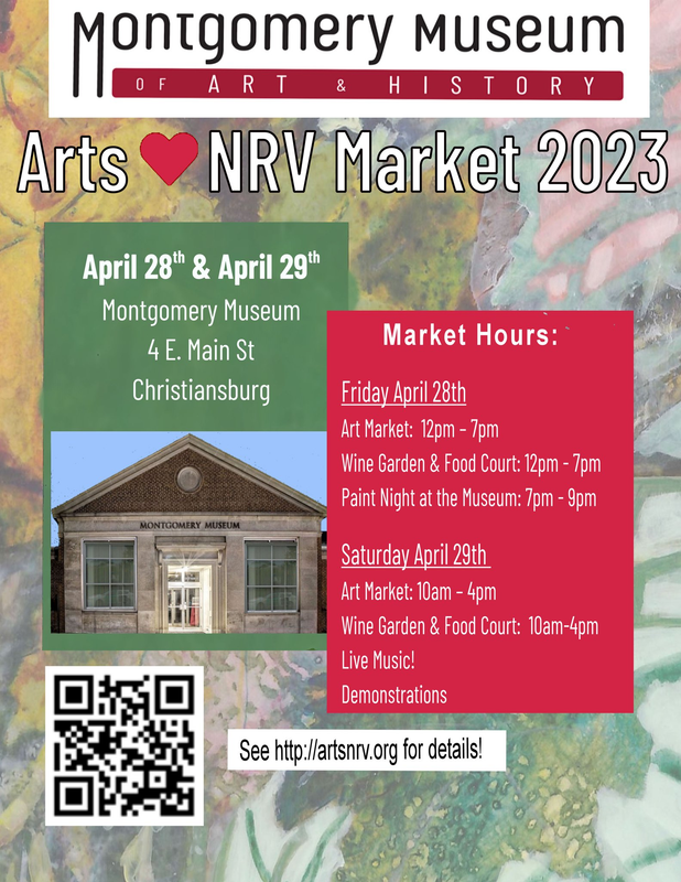 The Montgomery Museum of Art & History presents Arts NRV Market 2023 on Friday, April 28, 2023 and Saturday, April 29, 2023.