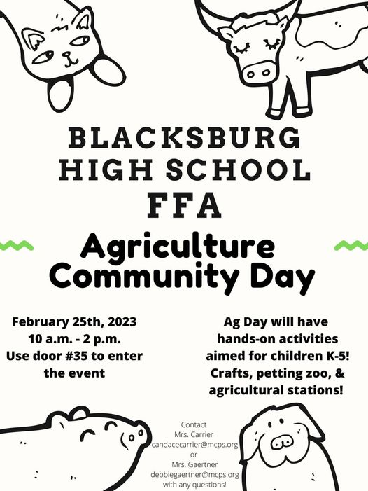 Blacksburg High School FFA presents their 2023 Blacksburg High FFA Agriculture Community Day on Saturday, February 25, 2023 at Blacksburg High School.