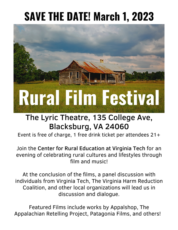 The Center for Rural Education at Virginia Tech presents the 2023 Rural Film Festival on Wednesday, March 1, 2023 at The Lyric Theatre.
