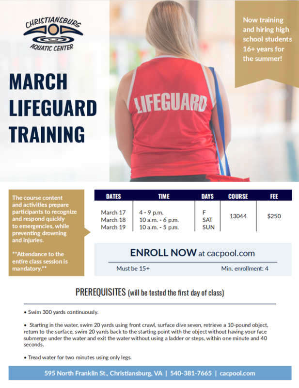 Christiansburg Aquatic Center presents a Three-Day Lifeguard Training starting on Friday, March 17, 2023 through Sunday, March 19, 2023 with a registration deadline of Sunday, March 12, 2023.