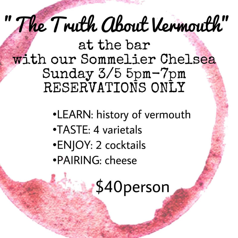 Enjoy "The Truth About Vermouth" at the bar with Twisted Liquid's Sommelier Chelsea. Learn about the history of Vermouth, taste four varietals, enjoy two cocktails and along with a cheese pairing.