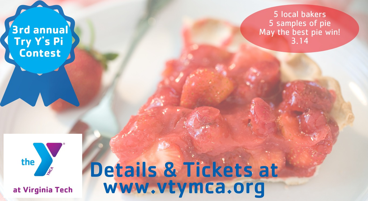 Join us for the 3rd annual YMCA at Virginia Tech "Try Y's Pi" in partnership with Our Daily Bread, Blacksburg Bagels, Next Door Bake Shop, and Halwa Bakery and vote for your favorite pie!