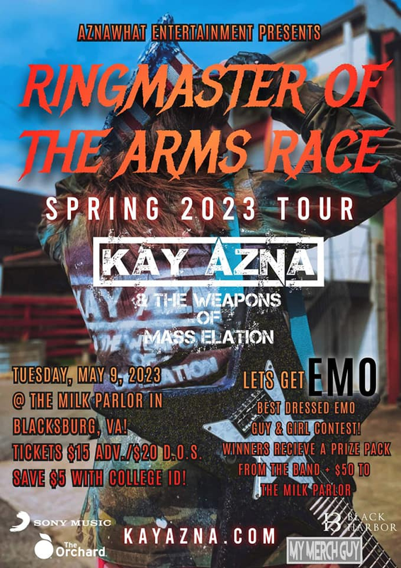The Milk Parlor presents Ringmaster Of The Arms Race Spring 2023 Tour with Kay Azna & The Weapons of Mass Elation in concert on Monday, March 6, 2023.