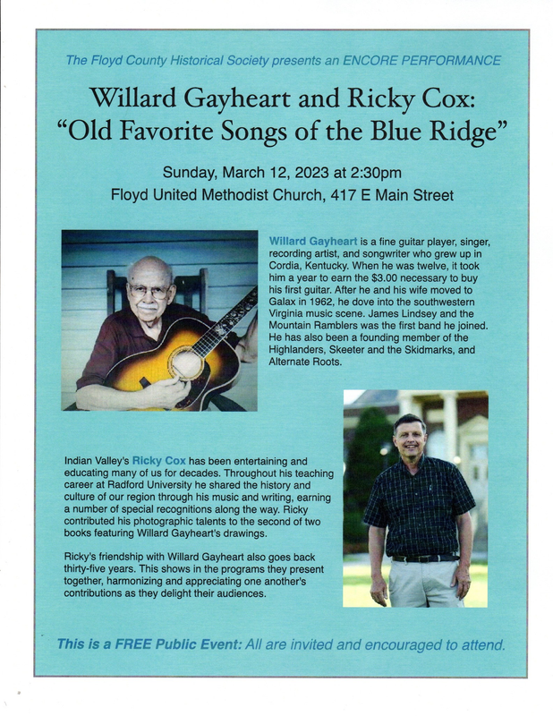 The Floyd County Historical Society presents an encore performance of Willard Gayheart and Ricky Cox performing "Old Favorite Songs of the Blue Ridge" on Sunday, March 12, 2023 at Floyd United Methodist Church.