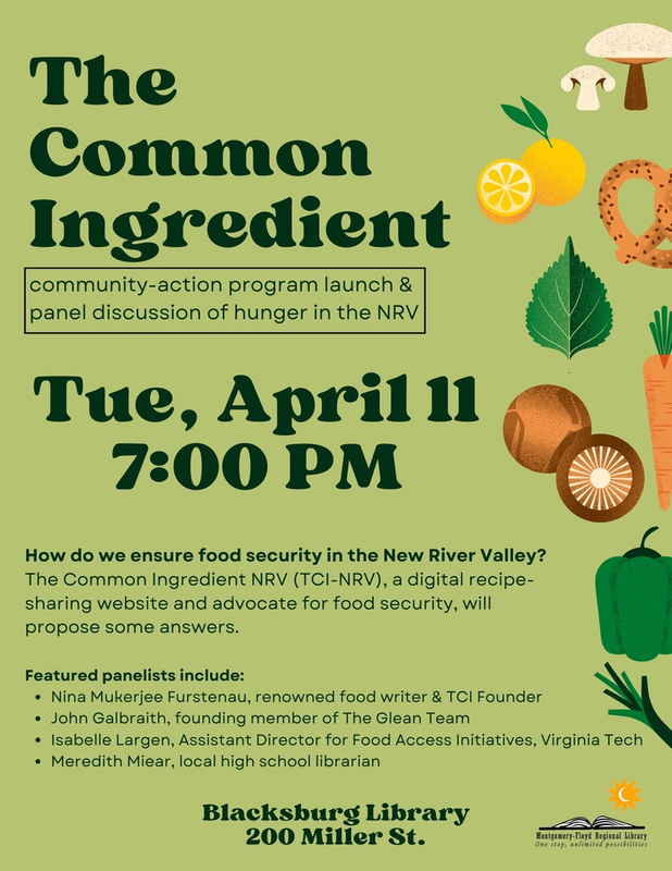 The Common Ingredient NRV (TCI-NRV) is a digital recipe-sharing website and advocate for food security focused on food’s power to connect us all. TCI-NRV along with its partner, the Blacksburg Library, will host a panel discussion to explore possible answers to this problem that affects so many of our NRV citizens.