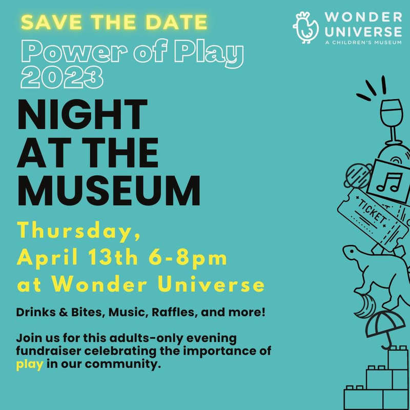 Wonder Universe: A Children's Museum presents Power of Play 2023: Night at the Museum for Adults on Thursday, April 13, 2023.