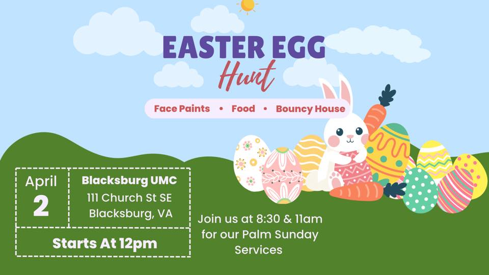 Join us at Blacksburg United Methodist Church for our Easter Egg Hunt! There will be a bounce house, sandwich bar, face painting, and so much more! Bring your baskets and excitement as we usher in the Easter season!