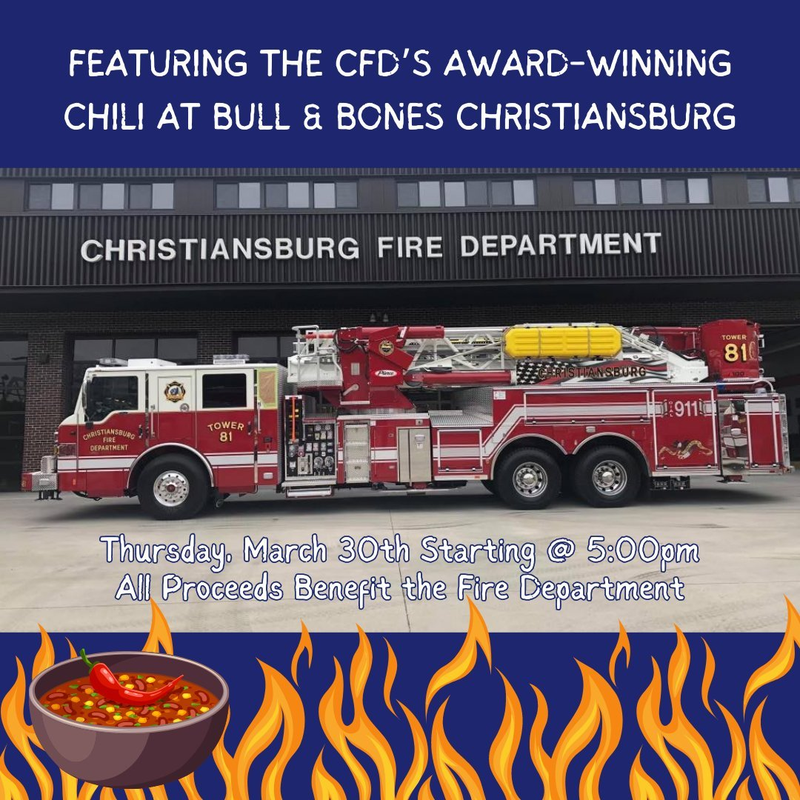 Bull & Bones Burgers, BBQ & Brewpub in Christiansburg, VA presents the Christiansburg Fire Department's Award Winning Chili Fundraiser on Thursday, March 30, 2023 starting at 5:00 PM.