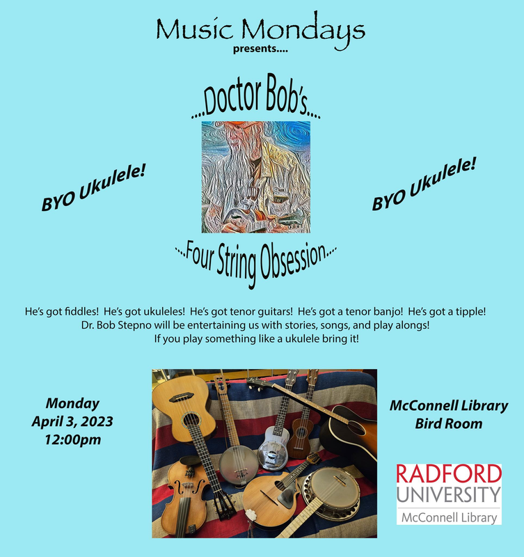 Radford University's McConnell Library continues their Music Mondays series with Doctor Bob's Four String Obsession on Monday, April 3, 2023 in the Bird Room.