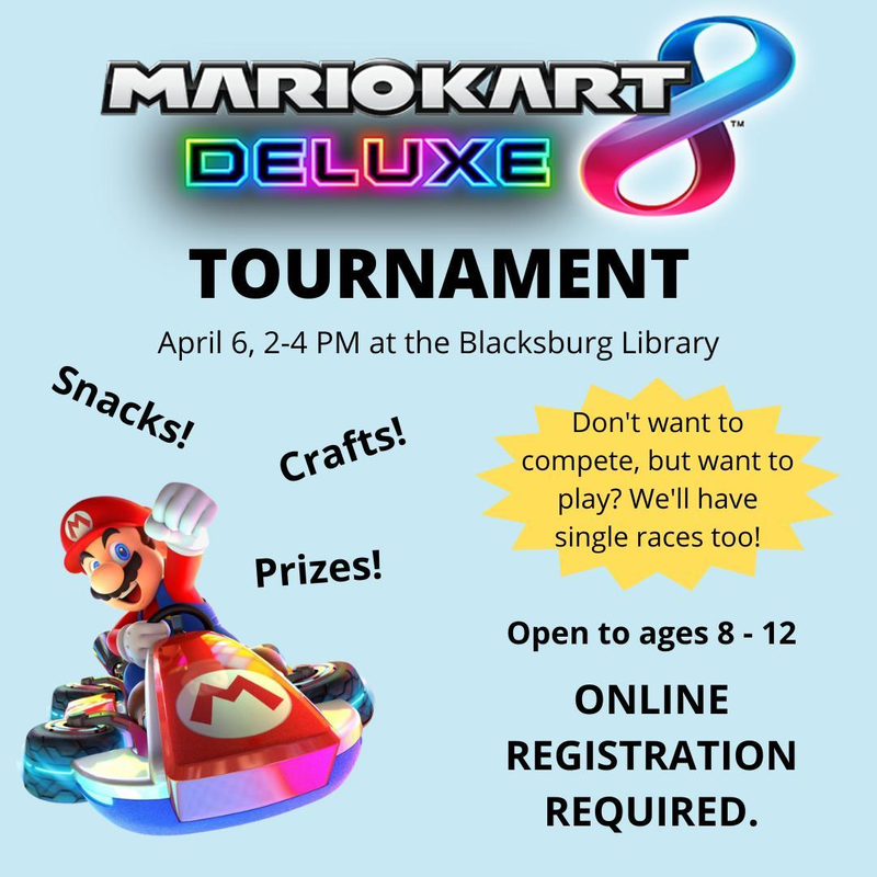 Blacksburg Library presents Mario Cart Tournament on Thursday, April 6, 2023.