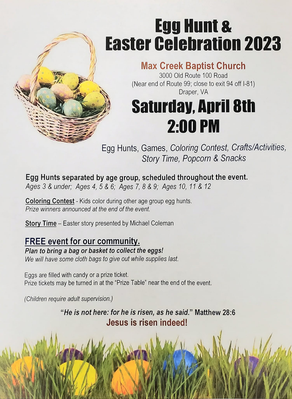 Max Creek Baptist Church presents their Egg Hunt & Easter Celebration 2023 on Saturday, April 8, 2023 on the church grounds and Fellowship Hall.