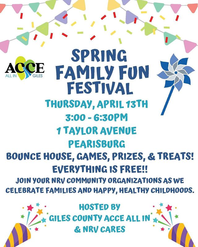 Access to Community College Education (ACCE) All In and NRV Cares presents the 2023 Spring Family Fun Festival on Thursday, April 13, 2023 at the Giles County Sheriff's Office.