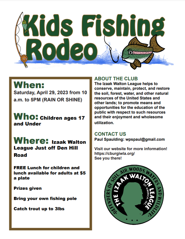The Izaak Walton League Christiansburg presents their Annual Spring Kids Fishing Rodeo on Saturday, April 29, 2023 at the Izaak Walton Facility in Christiansburg, VA.