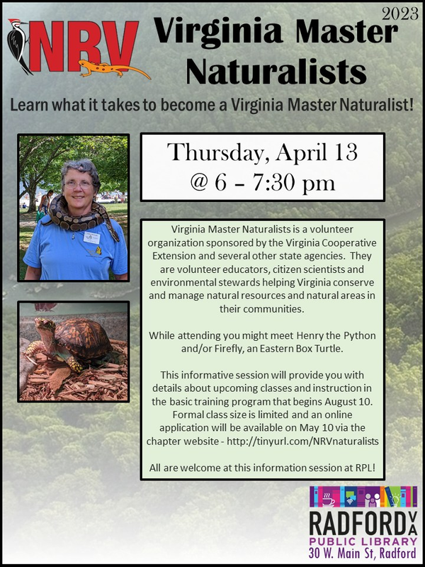 Radford Public Library presents the program "Learn What It Takes To Become A Virginia Master Naturalist" on Thursday, April 13, 2023.