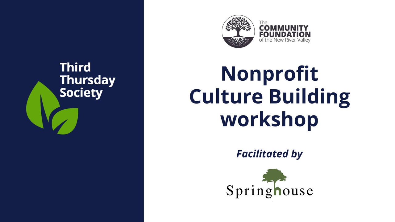 The Community Foundation of the New River Valley and Springhouse Community School present April's Third Thursday workshop with the theme "Nonprofit Culture Building" on Thursday, April 20, 2023 at The Blue Room in Christiansburg, VA.