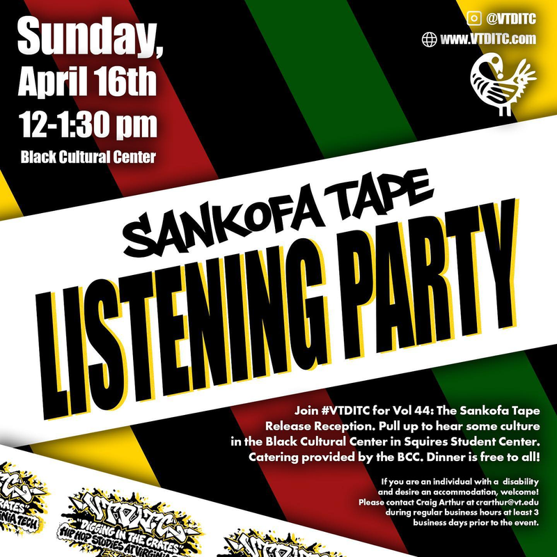 Hip Hop Studies at Virginia Tech (VTDITC) presents the Sankofa Tape Listening Party on Sunday, April 16, 2023 inside the Black Cultural Center located within the Squires Student Center on the campus of Virginia Tech.
