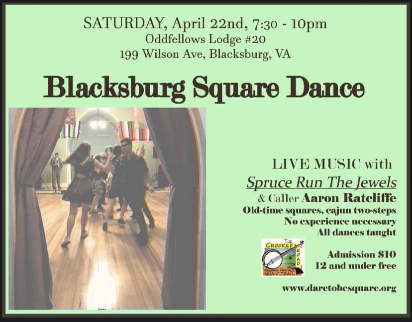 The Blacksburg Square Dance presents the April Blacksburg Square Dance on Saturday, April 22, 2023 at the Odd Fellows Building Lodge #20 (Wilson Avenue, Blacksburg).