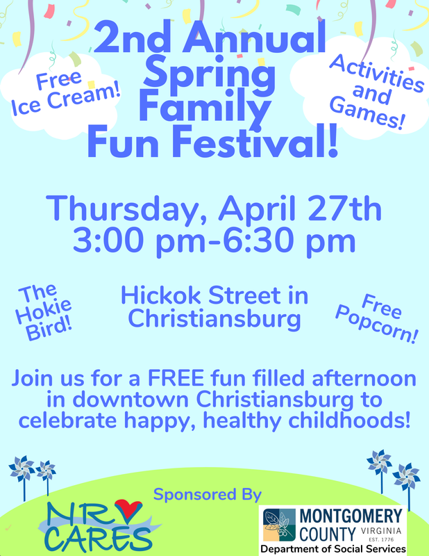 NRV Cares and the Montgomery County Department of Social Services presents the 2nd Annual Spring Family Fun Festival on Hickok Street in downtown Christiansburg, VA on Thursday, April 27, 2023.
