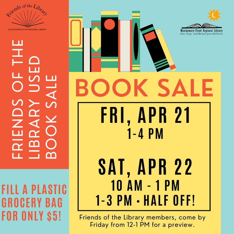 The Friends of the Library presents a Two-Day Used Book Sale on Friday, April 21, 2023 from 1:00-4:00 PM and Saturday, April 22, 2023 from 10:00 AM - 3:00 PM at Blacksburg Library.