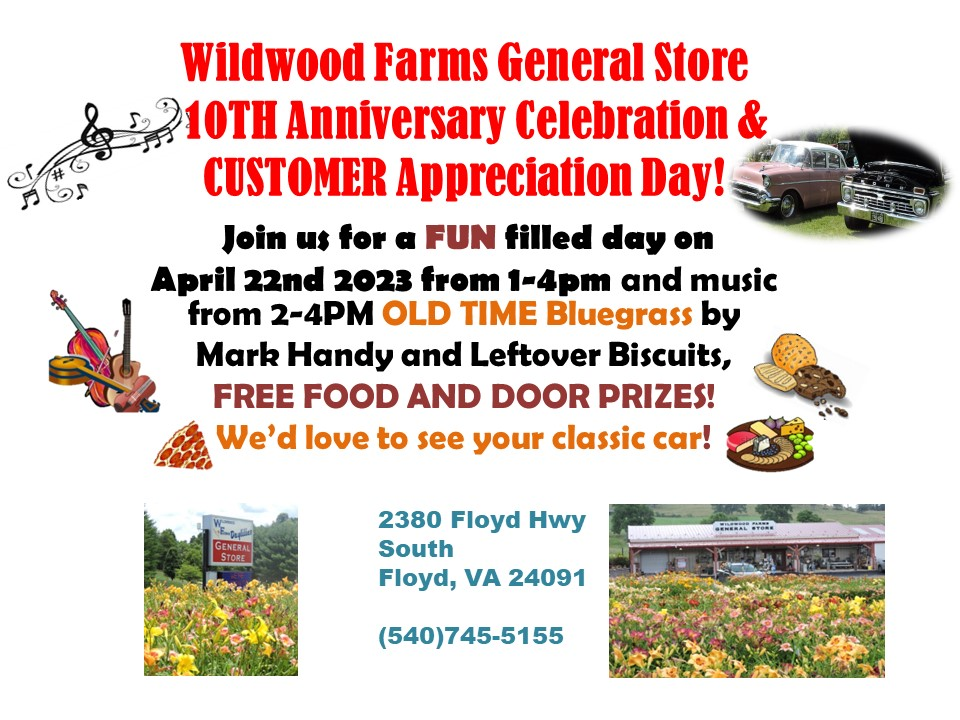 Wildwood Farms General Store presents their 10th Anniversary Celebration & Customer Appreciation Day on Saturday, April 22, 2023.