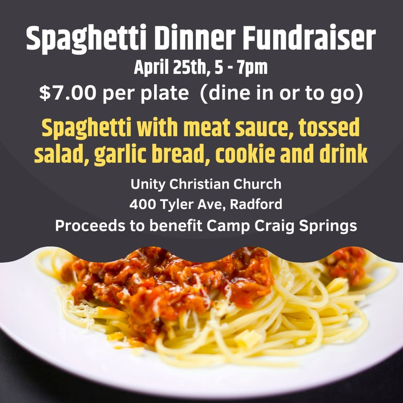 Unity Christian Church of Radford presents a Spaghetti Dinner Fundraiser on Tuesday, April 25, 2023.