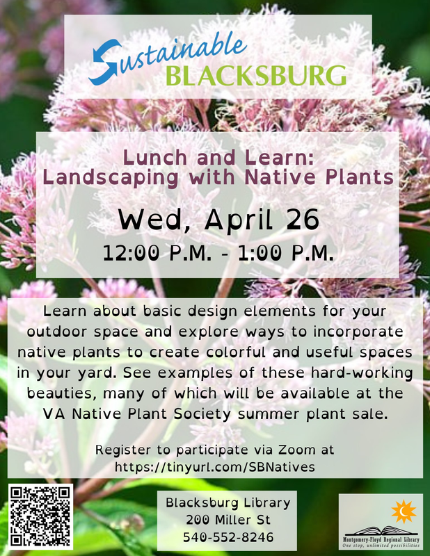 Sustainable Blacksburg continues their Lunch and Learn series with the event titled "Landscaping with Native Plants" on Wednesday, April 26, 2023 offered both in-person at the Blacksburg Library or online on Zoom.