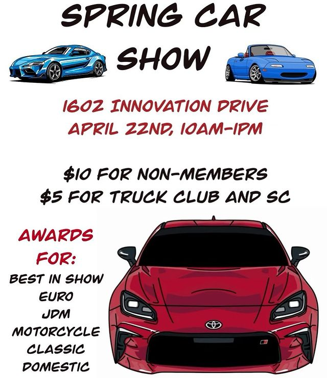 The Car Club at Virginia Tech (CCVT) presents their 2023 Spring Car Show on Saturday, April 22, 2023 in the parking lot at 1602 Innovation Drive in Blacksburg, VA within the Virginia Tech Corporate Research Center.