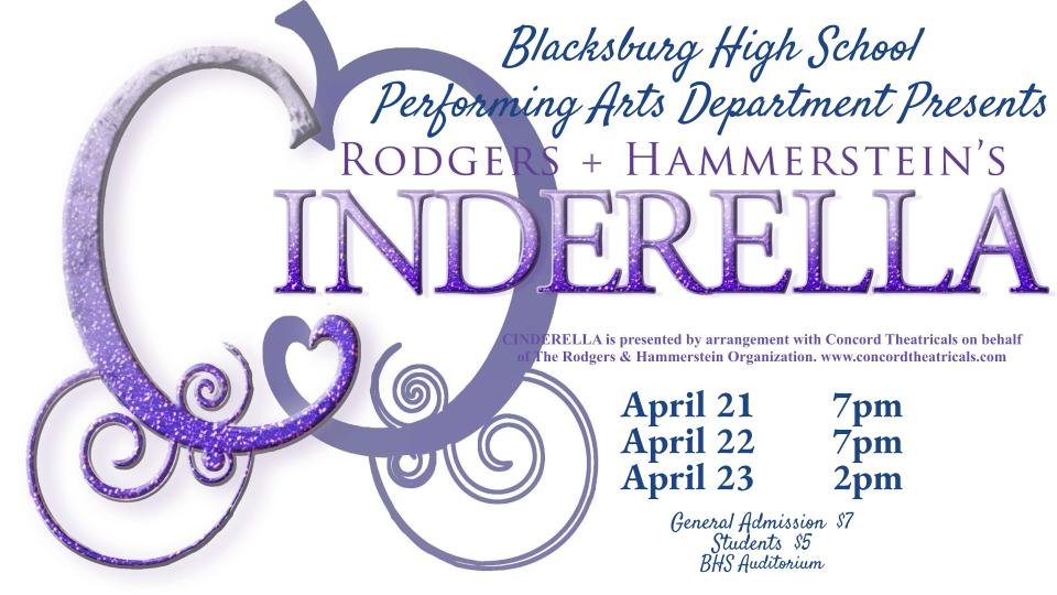 Blacksburg High School Performing Arts Department presents the play "Rodgers & Hammerstein's Cinderella" with three performances starting on Friday, April 21, 2023 and continuing through Sunday, April 23, 2023 in the Blacksburg High School Auditorium.