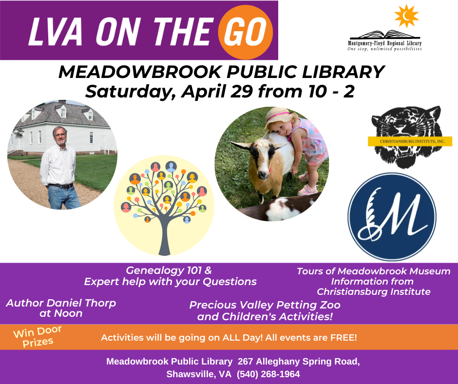 The event will feature an array of special guests for all ages, including Precious Valley Farms Petting Zoo, author Daniel Thorp, tours of the Meadowbrook Museum, and MFRL's Mobile Library, along with information from Christiansburg Institute. With genealogy help, reference tutorials, library card registration, oral history recordings, and children's activities, there will be something for everyone.