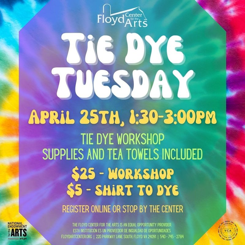 The Floyd Center for the Arts presents Tie Dye Tuesday on Tuesday, April 25, 2023 with two sections of the workshop at 1:30 PM and 2:15 PM.