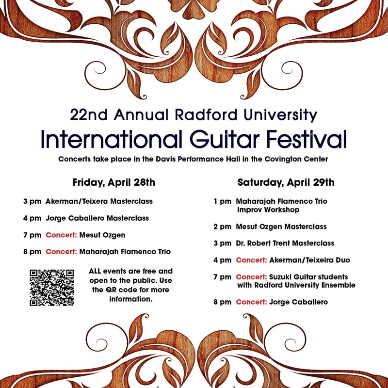 The Radford University College of Visual & Performing Arts presents the 22nd Annual Radford University International Guitar Festival on Friday, April 28, 2023 and Saturday, April 29, 2023 at Performance Hall inside the Covington Center on the campus of Radford University.