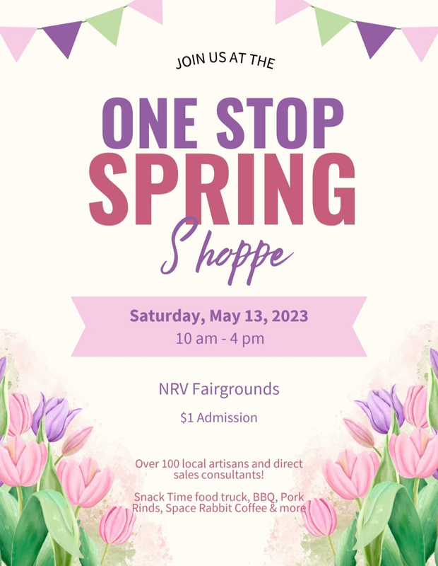 The 2023 One Stop Spring Shoppe will be held on Saturday, May 13, 2023 at New River Valley Fairgrounds in Dublin, VA.