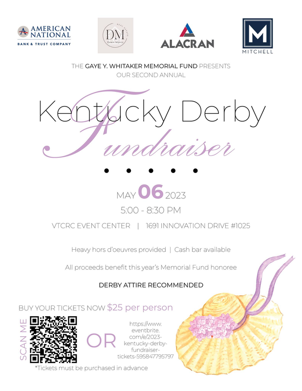 The Gaye Y. Whitaker Memorial Fund presents their Second Annual Kentucky Derby Fundraiser on Saturday, May 6, 2023 at the VTCRC Event Center located within the Virginia Tech Corporate Research Center.