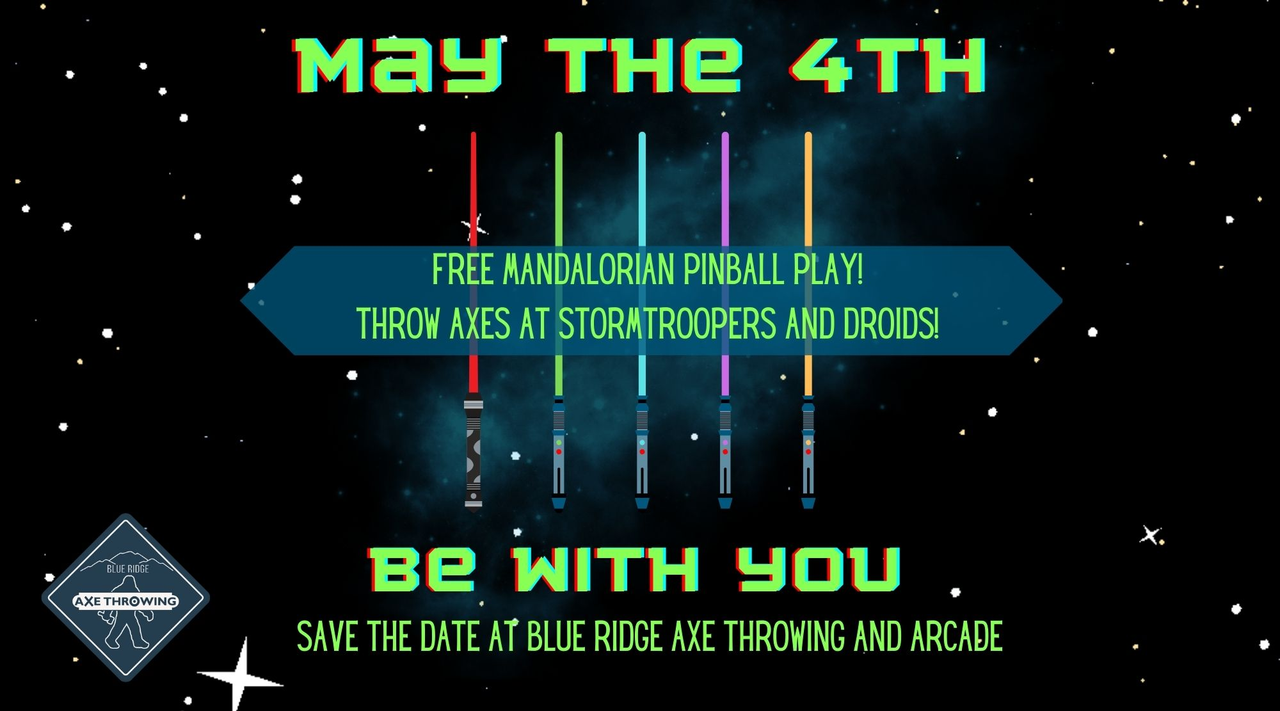 Blue Ridge Arcade and Axe Throwing presents May The 4th Celebration on Thursday, May 4, 2023.