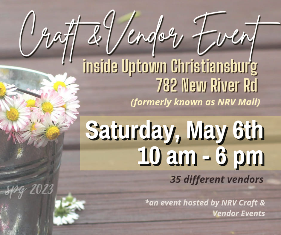 NRV Craft & Vendor Events hosts a Craft & Vendor Fair on Saturday, May 6, 2023 at Uptown Christiansburg (formerly New River Valley Mall).