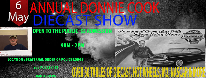 Now, Then & Forever Collectibles presents the Annual Donnie Cook NRV Diecast Show on Saturday, May 6, 2023 at the New River Valley Fraternal Order of Police Lodge.