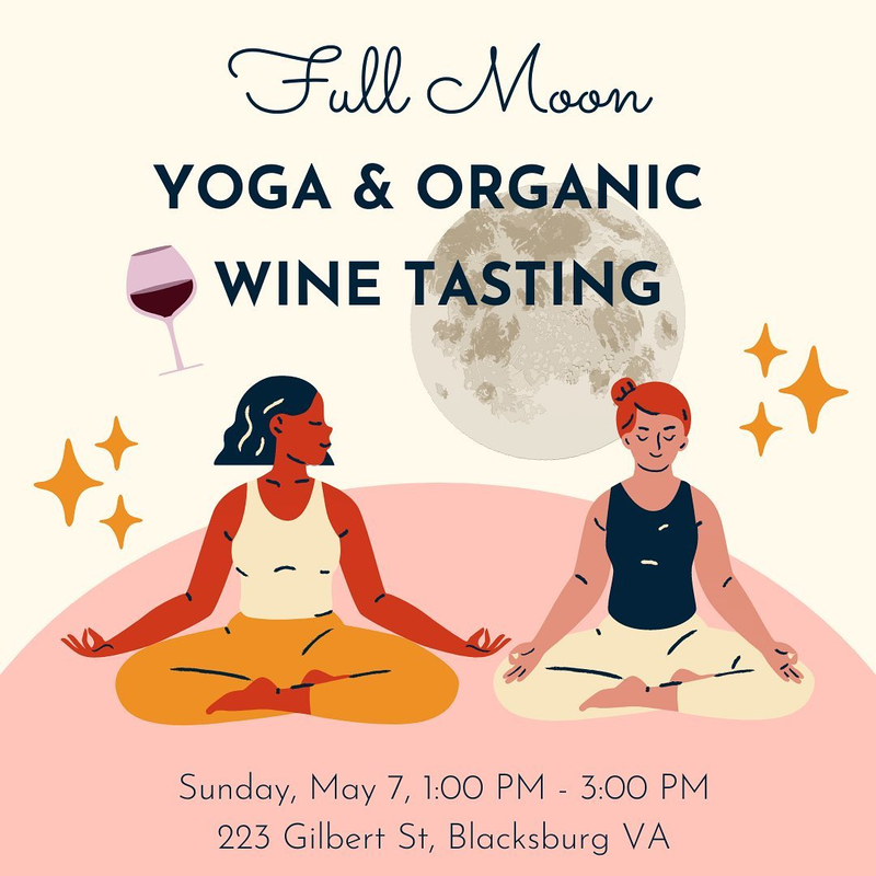 Blacksburg Wine Lab presents Full Moon Yoga & Organic Wine Tasting on Sunday, May 7, 2023.