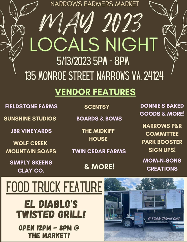 The Narrows Farmers Market presents the May 2023 Locals Night on Saturday, May 13, 2023.