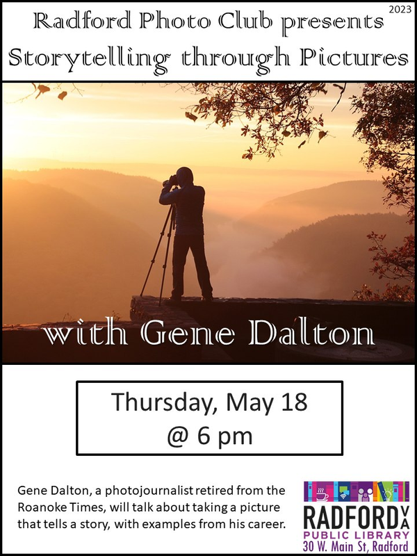 The Radford Photo Club presents "Storytelling through Pictures" with Gene Dalton on Thursday, May 18, 2023 at the Radford Public Library.