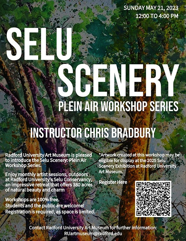 The Radford University College of Visual & Performing Arts continues their Plein Air Workshop Series with Selu Scenery on Sunday, May 21, 2023 at Selu Conservancy in Radford, VA.