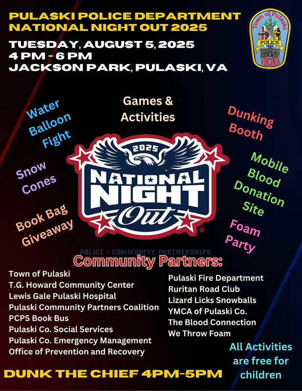 The Pulaski Police Department and the Town of Pulaski presents National Night Out with Pulaski Police Department on Tuesday, August 5, 2025 at Jackson Park.