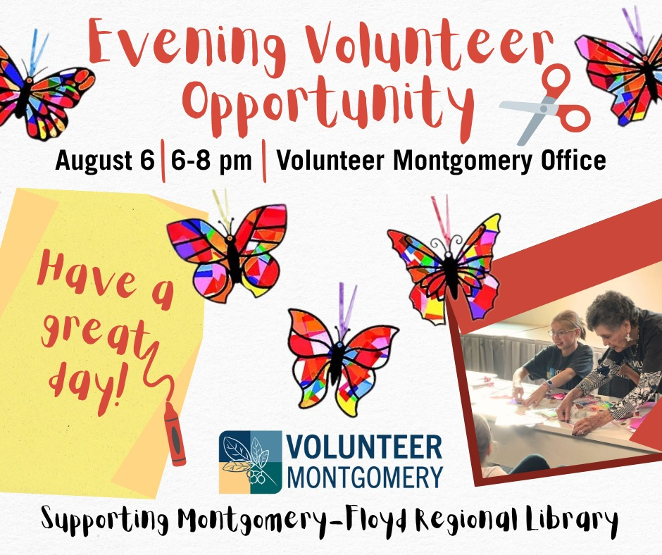 Volunteer Montgomery presents a Volunteer Opportunity, "Make Butterfly Suncatchers" to display at local libraries on Wednesday, August 6, 2025.