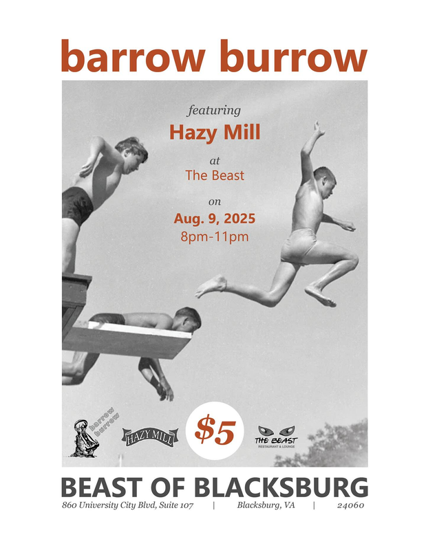The Beast of Blacksburg Pizzeria & Bar presents Barrow Burrow in concert featuring Hazy Mill on Saturday, August 9, 2025.