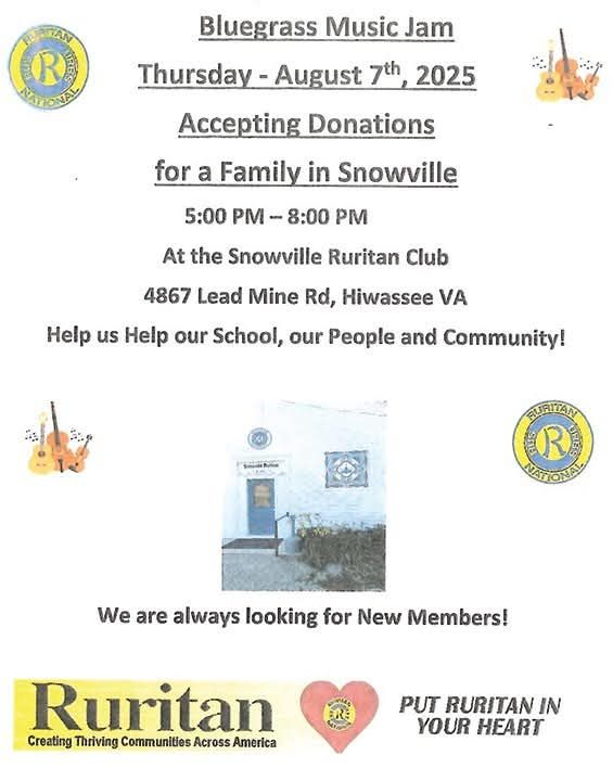The Snowville Ruritan Club presents a Bluegrass Music Jam Fundraiser for a local Snowville family on Thursday, August 7, 2025.