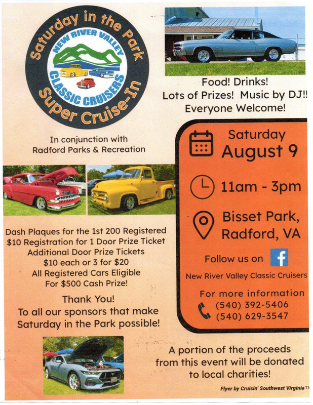 New River Valley Classic Cruisers and the Radford Parks and Recreation Department present the Annual Saturday in the Park Super Cruise-In on Saturday, August 9, 2025 at Bisset Park.