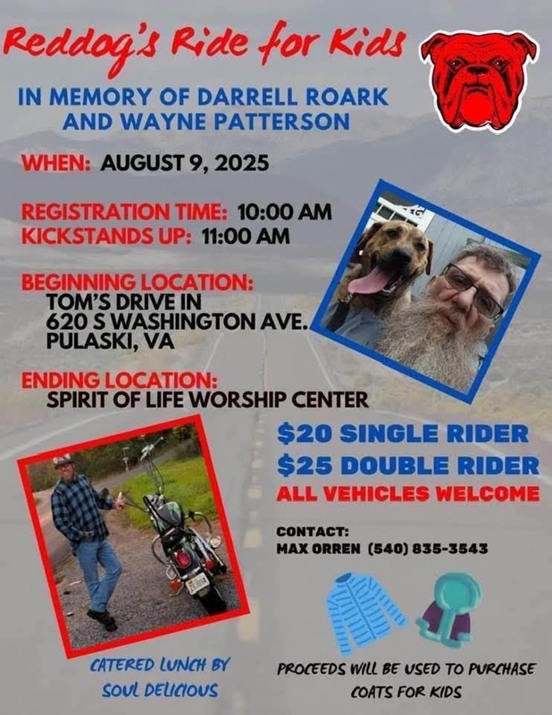 Reddog's Ride for Kids will be held on Saturday, August 9, 2025 starting at Tom's Drive-In in Pulaski, VA and ending at the Spirit of Life Worship Center in Pulaski, VA.